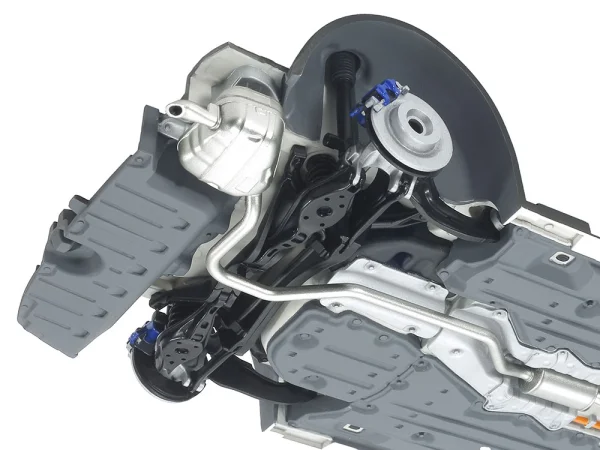 Het onderstel is volledig gedetailleerd en toont zichtbare perslijnen, een natuurgetrouwe vierwielophanging en een realistische weergave van uitlaat en demper. De voorwielophanging is uitgevoerd als dual-axis strut, een constructie die verwantschap toont met die van de Civic Type R en bijdraagt aan nauwkeurige besturing. Aan de achterzijde is de multilink-ophanging correct nagebootst, inclusief bevestigingspunten en geometrie.
