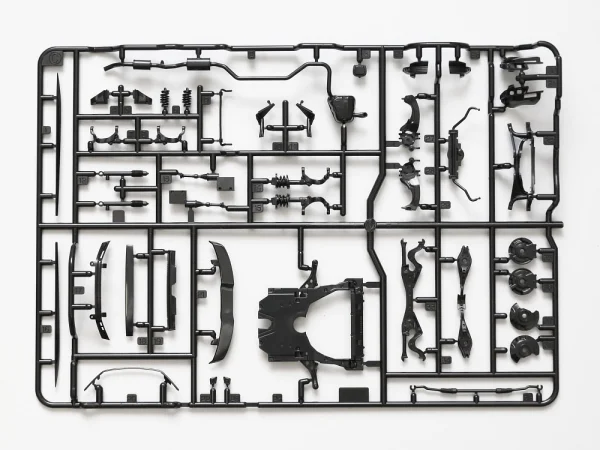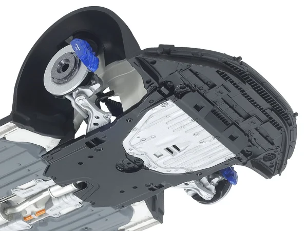 Een opvallend sterk punt van deze 1:24 kit is de aandacht voor de onderzijde. Waar dit bij veel automodellen beperkt blijft tot globale vormen, is hier gekozen voor een gedetailleerde weergave van perslijnen, ophangingscomponenten en technische details. Zowel de voor- als achterophanging zijn duidelijk herkenbaar en geven een goed beeld van de constructie van de echte auto.