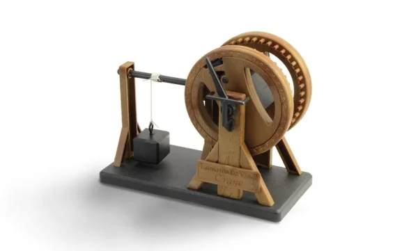 Daarnaast is de kraan volledig functioneel binnen de beperkingen van het schaalmodel. Door het ratelmechanisme en de tandheugel daadwerkelijk na te bouwen ervaar je zelf welke geniale oplossingen Leonardo wist te bedenken voor praktische vraagstukken in zijn tijd.