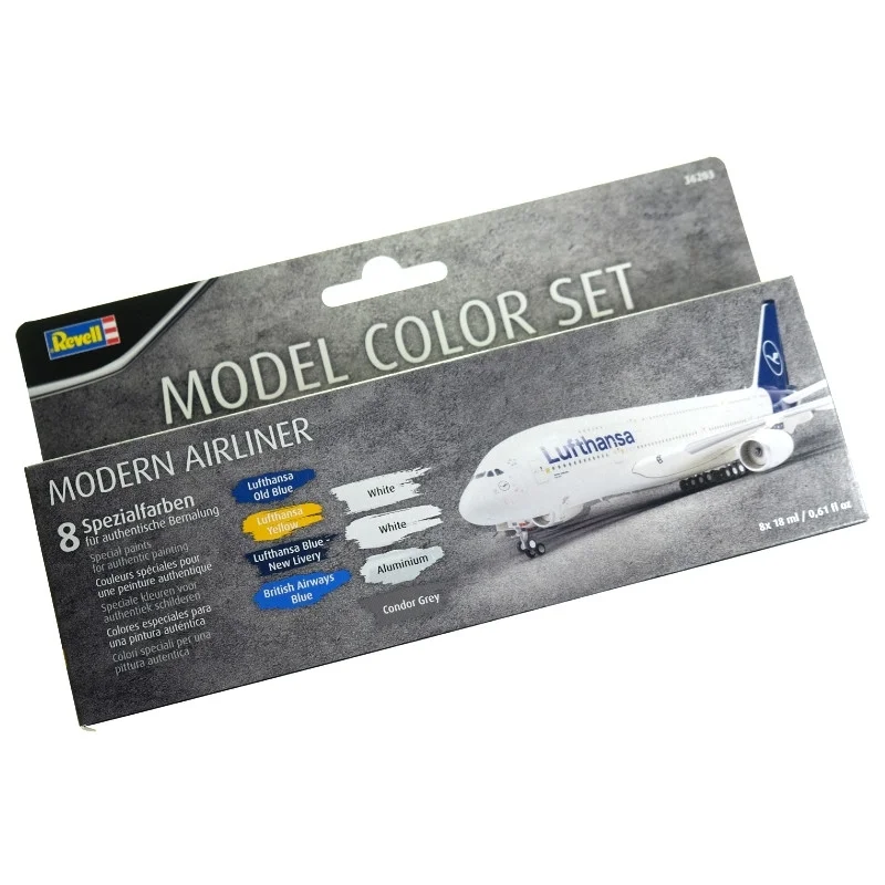 * 8 speciale kleuren; Lufthansa old blue, Lufthansa yellow, Lufthansa Blue New livery, British airways blue, white 2x, Aluminium, Condor Grey (elk 17 ml), speciaal afgestemd op de lak van moderne vliegtuigen Toepassingsmogelijkheden: De verfset is ideaal voor modelbouwers met verschillende ervaringsniveaus: Beginner (niveau 1-3): Eenvoudige bediening maakt het gemakkelijk om aan de slag te gaan. Gevorderd (niveau 4): Ideaal voor modelbouwers die hun detailschilder- en afwerkingstechnieken willen verbeteren. Expert (niveau 5): Biedt de precisie en kwaliteit die nodig zijn voor veeleisende projecten. Speciale kenmerken: Speciale kleurkeuze: Unieke kleurschakeringen speciaal ontwikkeld voor modern vliegtuiglakwerk. Gebruiksgemak: Directe toepassing zonder verdunning bespaart tijd en moeite. Veelzijdigheid: geschikt voor zowel airbrush- als penseeltoepassingen. Nauwkeurige dosering: ideaal voor gedetailleerd werk dankzij de flespunt.