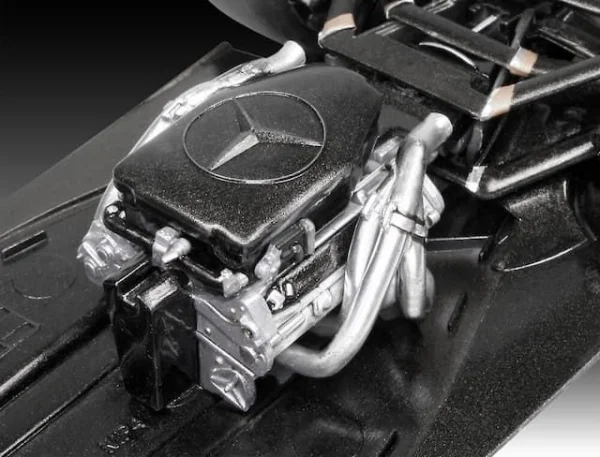 Gedetailleerde, meerdelige Mercedes-motor met zichtbare technische componenten