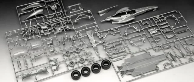 Gedetailleerde onderdelen in grijs, rood en zwart kunststof