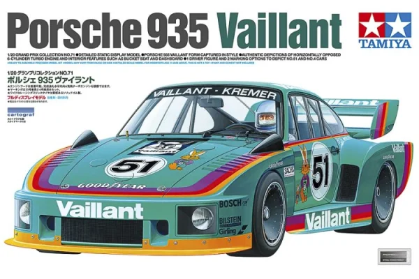 De Porsche 935 die in 1977 deelnam aan de Groep 5-race wordt nieuw leven ingeblazen op schaal 1/20, met de Duitse fabrikant van airconditioningapparatuur Vaillant als hoofdsponsor. Realistische modellering van de krachtige figuur die bekend staat als Silhouette Formula. De horizontaal tegenover elkaar liggende 6-cilinder turbomotor, ophanging en cockpit met rolkooi zijn driedimensionaal afgewerkt.